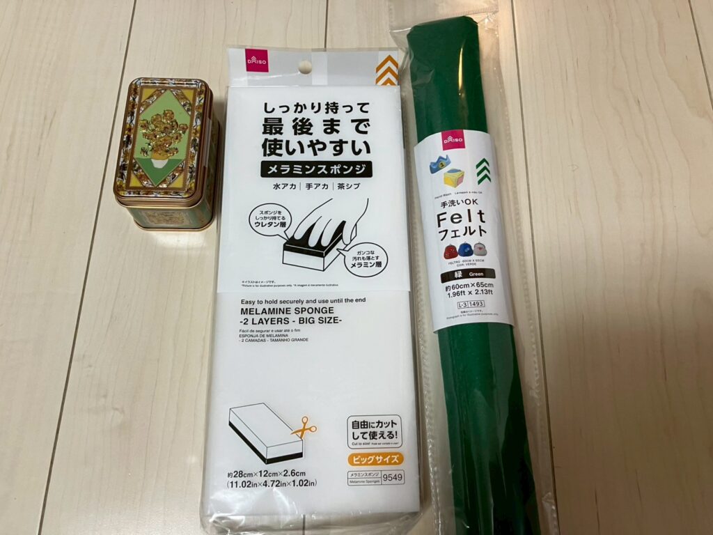 100均でフェルトとメラミンスポンジを購入しました。メラミンスポンジではなくても、ある程度かたさがあるものなら何でも良い気がします。