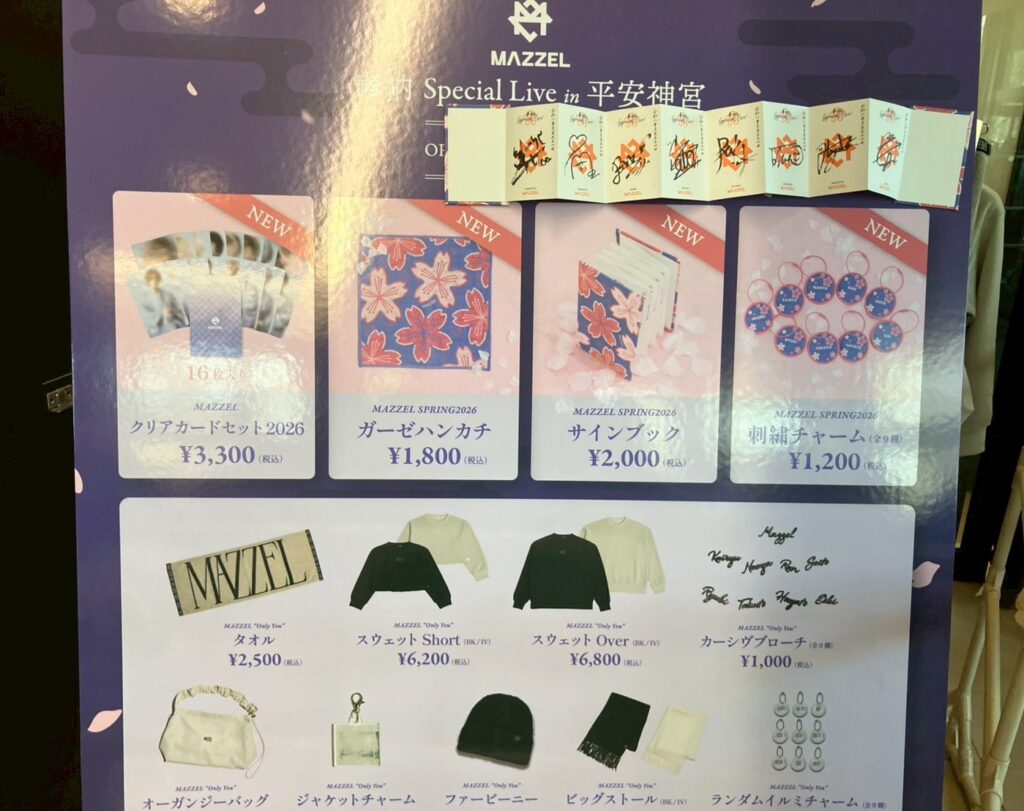 御鎮座百三十年を迎えた、京都の平安神宮で行われたMAZZELの奉納スペシャルライブに行ってきました。大好きな京都&平安神宮で、大好きなMAZZELがライブをするという歴史的な瞬間に立ち会えたことに感謝です。セットリスト(セトリ)とレポ&感想を綴ります。ネタバレにご注意ください。間違いがあったらごめんなさい。メンバーの写真は公式からお借りしています。MAZZEL 2nd One Man Tour 2025 Royal Straight Flush セットリスト(セトリ)と感想、レポはこちらです。MAZZELのミニライブ@名古屋のDIAMOND HALL(ダイアモンドホール)に行ってきました【セトリ、レポ&感想】はこちらです。